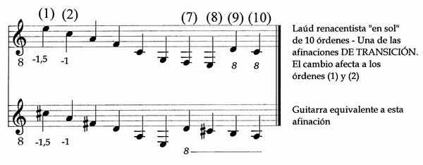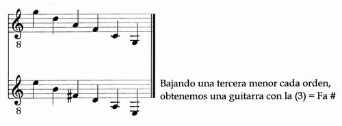 O a la inversa, si descendemos una tercera menor los 6 órdenes del laúd renacentista obtenemos una guitarra con la tercera afinada en fa #.