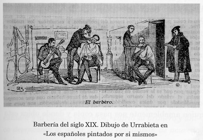 [10] Existía una clase de barberos aún más humilde y pintoresca. Eran los barberos ambulantes, quienes con su utillaje en bolsas, afeitaban a la intemperie muy económicamente. Solían colocarse en las proximidades de alguna fuente pública, por razones obvias. No nos resistimos a reproducir unas líneas de Davillier –también lo haría Antonio Flores (págs. 1038 y 1039)- explicando un gracioso recurso usado por estos barberos para afeitar a los clientes, aunque no tengan nada que ver con la guitarra: