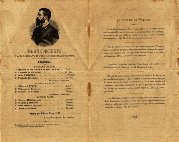 Y al final Tárrega. El mismísimo señor don Francisco Tárrega en Sevilla: quien el domingo a las tres de la tarde dará un concierto de guitarra, a ruego de sus amigos y admiradores, interpretando en el programa, entre otras piezas, los "Aires Nacionales", de Arcas