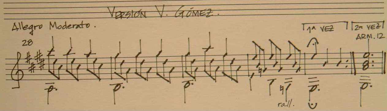 También, la versión de Gómez es la única (entre las que he visto) donde en los compases 31 y 32 introduce una modificación en el Sol, haciéndolo natural, y definiendo así un final en tono menor (dentro de la sección en tonalidad mayor).