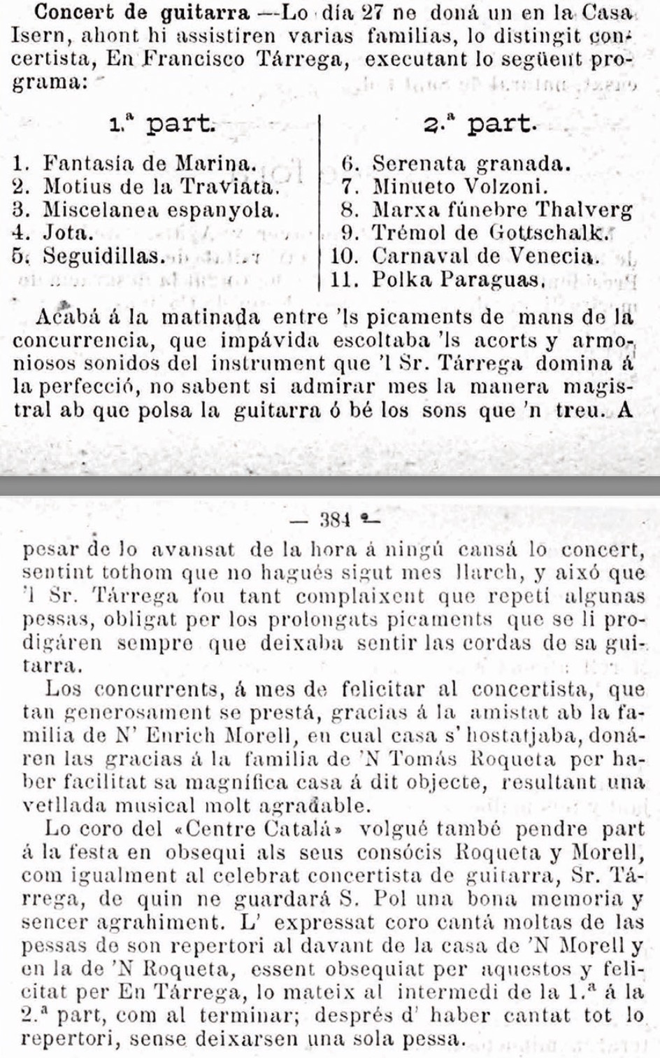 Los concurrentes, aparte de felicitar al concertista, que tan generosamente se prestó, gracias a la amistad con la familia de Don Enrique Morell, en cuya casa se hospedada, dieron las gracias a la familia de Don Tomás Roqueta por haber facilitado su magnífica casa para dicho objeto, resultando una velada musical muy agradable. El coro del “Centro Catalán” quiso también tomar parte en la fiesta y obsequió a sus socios Roqueta y Morell, como igualmente al celebrado concertista de guitarra, Sr. Tárrega, de quien guardará S. Pol buena memoria y sincero agradecimiento. El expresado coro cantó muchas de las piezas de su repertorio delante de la casa del señor Morell y en la del señor Roqueta, siendo obsequiado por estos y felicitado por el señor Tárrega, lo mismo en el intermedio de la 1ª a la 2ª parte, como al terminar; después de haber cantado todo el repertorio, sin dejarse ni una sola pieza.