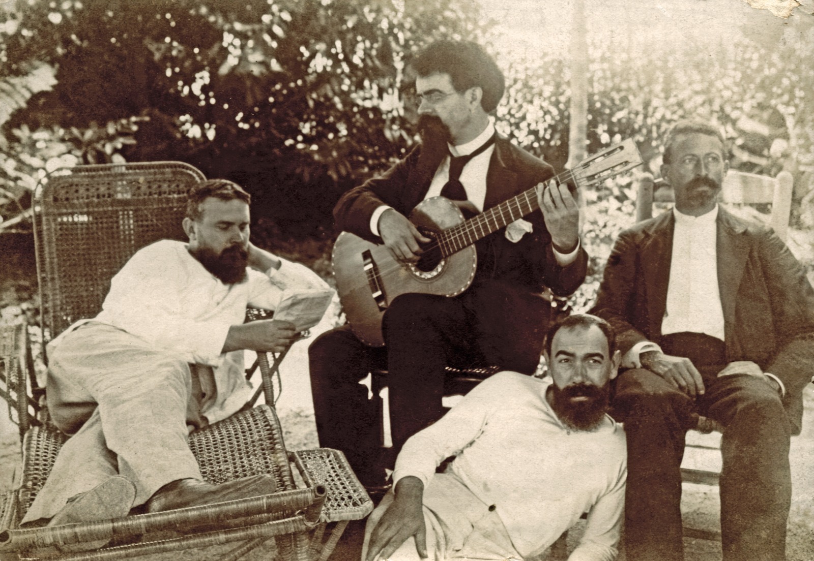Fig. 5. Fotografía de Francisco Tárrega en San Pol de Mar, muy probablemente tomada en el jardín de la casa de Enric Morell. Arriba y de izquierda a derecha, Enric Morell, Tárrega y Magi Paulís i Roura. El hombre recostado, más abajo en la fotografía, podría ser Domingo Mas Soler.(12)