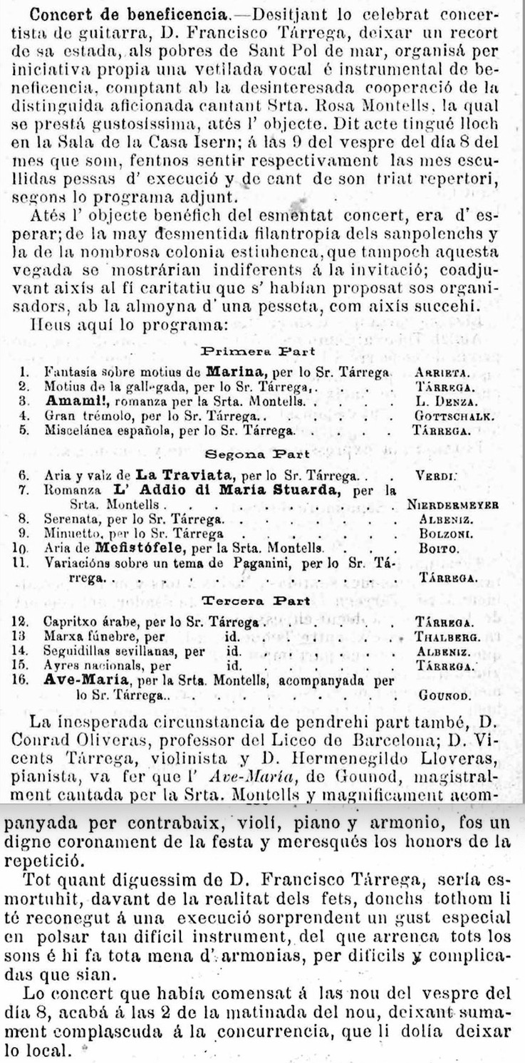 Concierto de beneficencia.- Deseando el celebrado concertista de guitarra, D. Francisco Tárrega, dejar un recuerdo de su estancia a los pobres de San Pol de mar, organizó por iniciativa propia una velada vocal e instrumental de beneficencia, contando con la desinteresada cooperación de la distinguida aficionada cantante Srta. Rosa Montells, la cual se prestó gustosísima, atendido el objeto. Dicho acto tuvo lugar en la Sala de la Casa Isern a las 9 de la noche del día 8 del mes corriente, haciéndonos escuchar respectivamente las más escogidas piezas de ejecución y de canto de su selecto repertorio, según el programa adjunto.