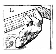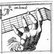 La prima, y la segunda en el cuarto traste con el meñique; la tercera y la cuarta en el primer traste con el índice; la quinta en el segundo traste con el medio.SANZ 1674 (fol. 15 r) digita de idéntica manera ese acorde (aunque lo nombra de distinta forma), como vemos en la fig. 13.