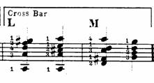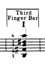 FODEN 1920: 26 nos explica la hinge bar o cejilla bisagra, en la que el extremo superior o inferior del dedo que hace la cejilla se levanta momentáneamente para permitir pulsar una cuerda al aire. En la fig. 9 vemos los ejemplos dados por Foden.![]()
