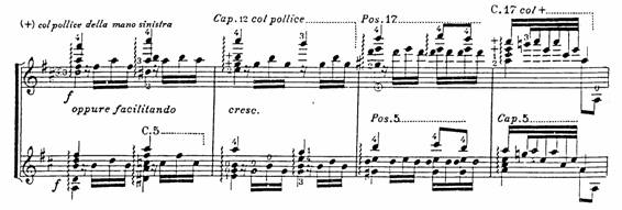 Precisamente en el Preludio, op. 36 de Terzi, Imitando l’arpa, publicado en Milán en 1926, encontramos una de las infrecuentes cejillas hechas con el pulgar de la mano izquierda (véase fig. 6). Dada las dificultades que entraña esta técnica, no es extraño que se dé un alternativa facilitada para ese pasaje.