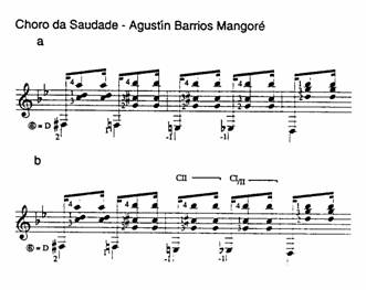Otra modalidad de cejilla ladeada sería aquella en la que la punta del índice pisa en un traste más atrás que la cejilla. KOONCE 1993: 48, nos recomienda una cejilla así para un pasaje de la obra de Agustín Barrios Choro da saudade (véase fig. 8).