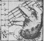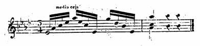 Tambien el dedo al que llamamos quarto dedo, algunas veces tiene que hacer media zegilla...En la fig 3, vemos un ejemplo de cejilla con el dedo 4, que nos brinda el alemán Carl Eulenstein (1802-1890) en su método (EULENSTEIN 1830: 12).